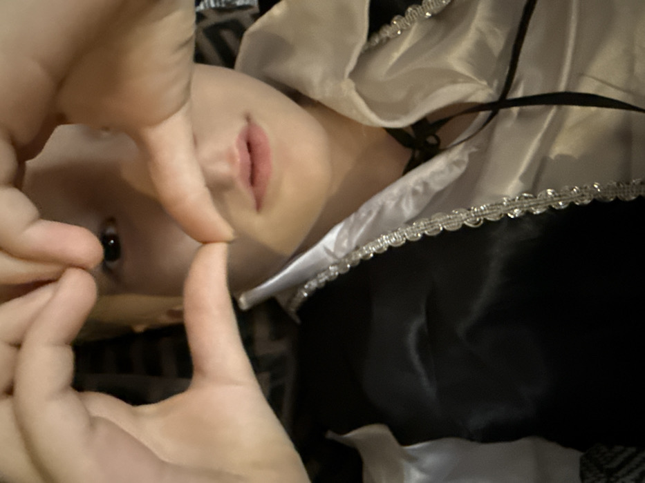 A close-up photograph taken in Dmitrov, Russia, depicts a young individual. The subject's hands are positioned to form a heart shape directly in front of their face. The right eye is visible through the upper opening of the hand-formed heart, and the mouth is visible below the hands. The individual is wearing a costume featuring a white ruffled collar shirt secured with a black ribbon tie. A black, satin-like garment, possibly a cape or jacket, is worn over the shirt. Both the white collar and the black garment are adorned with a silver, beaded trim. The background is dark and out of focus, indicating an indoor setting with ambient, diffused illumination.