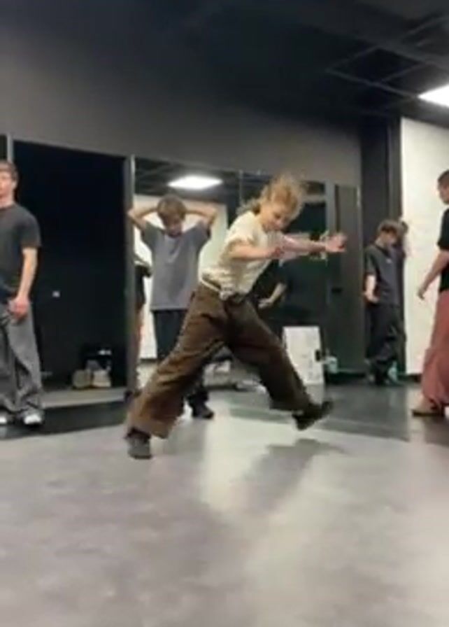 group of young people in a dance studio. The room has a black ceiling, grey floors, and a mirrored wall. A young person in a white t-shirt and baggy brown pants performs a handstand, and then moves into a complicated breakdancing sequence. The other people are watching.