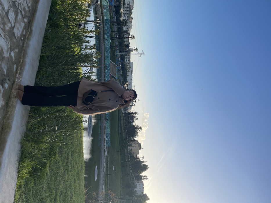 A person in a tan jacket and dark pants stands near a grassy area next to a body of water. The person shields their eyes with their hand. Buildings and trees line the water's edge. The sky is bright blue. The image is rotated 90 degrees.