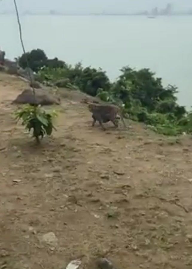 landscape with a body of water in the background, the horizon marked by indistinct city buildings. The foreground is elevated ground covered with sparse vegetation and a scattering of litter. A monkey, carrying a smaller monkey on its back, walks across the ground towards a cluster of rocks and other monkeys in the middle distance. A person is partially visible on the left side of the frame, with a bag on their back. The sky is overcast, suggesting an overcast day.