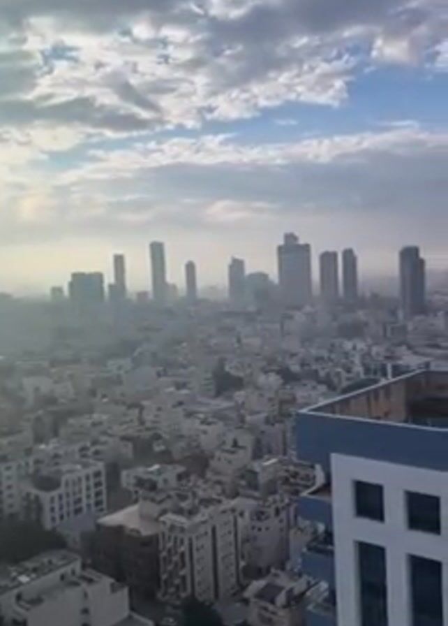 wide shot of a cityscape with tall buildings in the distance under a cloudy sky. The camera pans from left to right, revealing more of the city and eventually the coastline and beach. The foreground includes a building with a blue and white facade. The sky is overcast with patches of blue visible between the clouds.