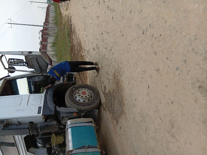 The image captures an outdoor scene on an unpaved dirt road in Shagamu, Nigeria, under an overcast sky. A white Mercedes-Benz Actros truck, identified by branding on its side panel, is stationary on the left, with its driver's side door ajar. A male individual, wearing a blue t-shirt with "CWAY" printed in yellow, black trousers, and brown footwear, stands beside the open door, leaning into the truck's cabin. His left arm is extended towards the vehicle, and his right hand is near his head. A blue-green fuel tank and a yellow bucket are visible on the truck's left side. A dark liquid stain is present on the dirt surface beneath the truck's front wheel. In the mid-ground, a long concrete perimeter wall topped with red-roofed structures extends horizontally. Multiple utility poles with power lines line the right side of the road. A second individual, clad in a red top, is partially visible in the far background on the right.