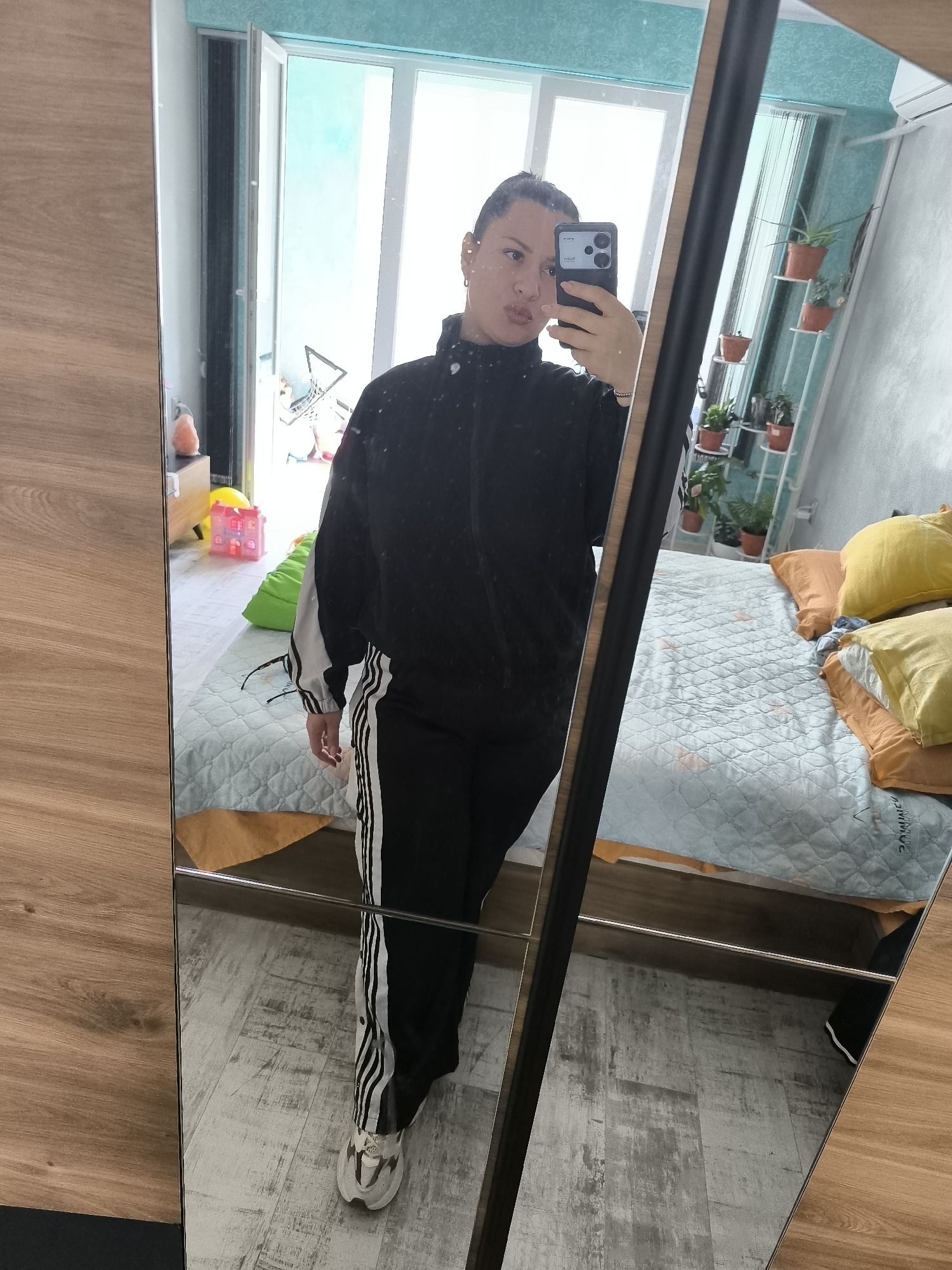 A woman is standing in front of a mirror in a room. The room contains a bed with blue and orange bedding, yellow pillows, a plant stand with several potted plants, a green beanbag chair, and toys. The woman is wearing a black tracksuit with white stripes down the sides and white sneakers. She is holding a smartphone up to take a photo in the mirror. The room has an open doorway to the outside with a view of what looks like a city setting. Based on the presence of Bulgarian text on the bedsheets, it is possible the location is in Bulgaria. There is no definitive information available within the image to ascertain that the location is in Pleven, Bulgaria.
