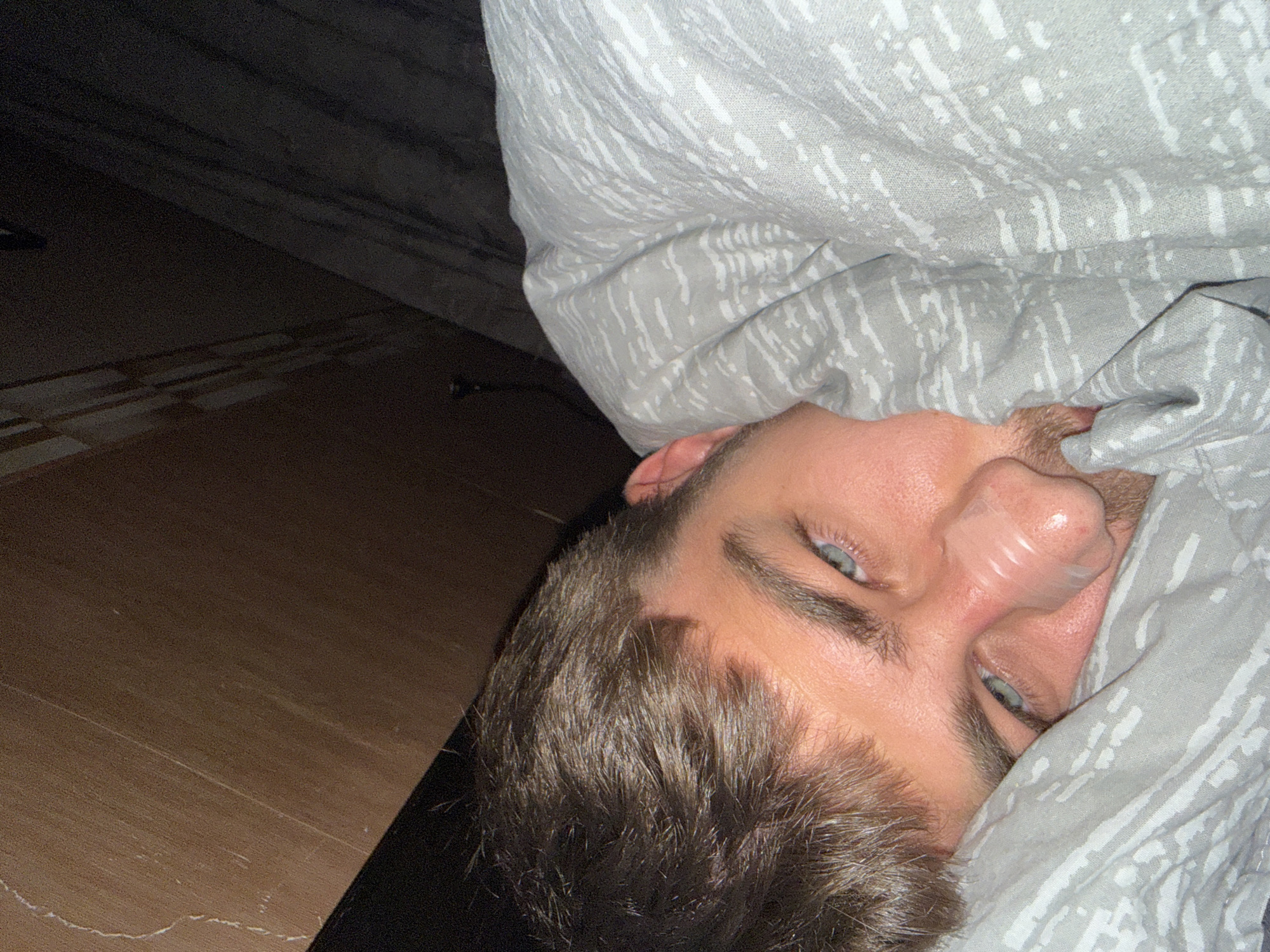 A man is lying in bed, covered by a grey and white patterned blanket. The floor next to the bed is wood, possibly parquet. The man has short brown hair, fair skin, and blue eyes. He appears to have a clear bandage or strip of tape on his nose. The location is not identifiable as Sofia, Bulgaria from the provided image.