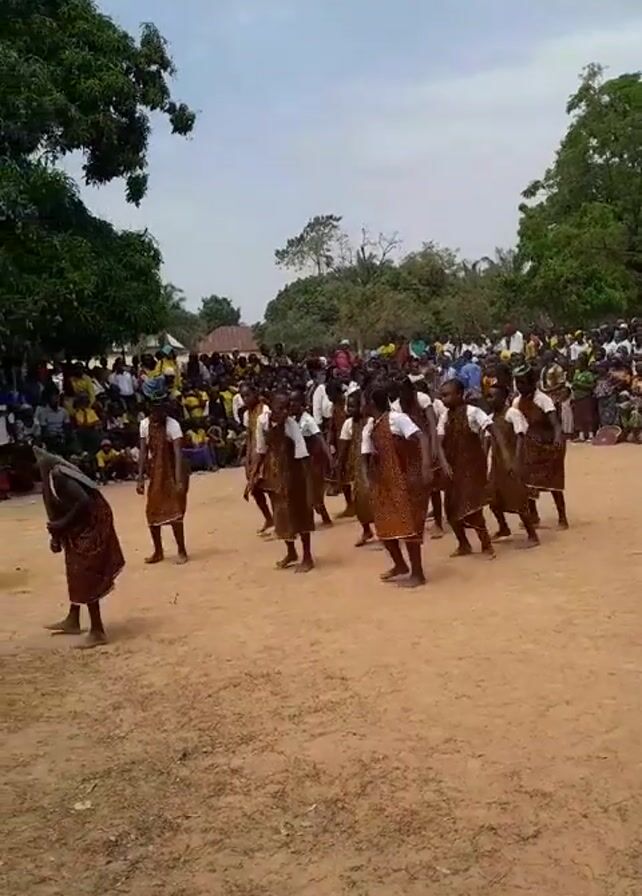 A group of people in matching outfits stand on a dirt field, performing a dance for a large crowd. The dancers are wearing a brown patterned cloth, with white shirts underneath. In front of them is a small group of additional dancers in different, but colorful, fabrics. A dense crowd of people sits in the background, watching the performance. There are large trees surrounding the clearing. The sky is pale blue with some clouds.