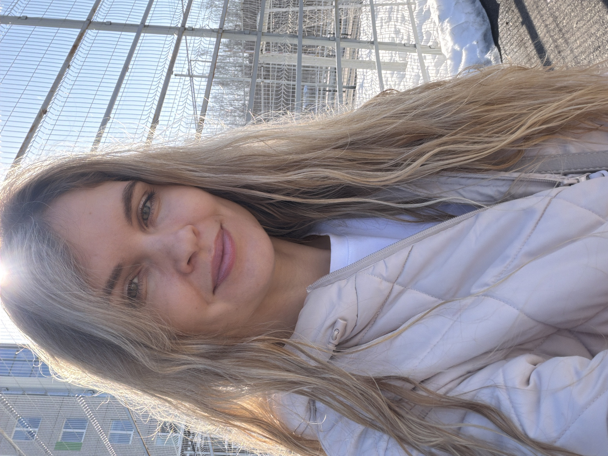 A blonde woman poses for a selfie on a pedestrian overpass in Izhevsk, Russia. The woman, with long, wavy hair and wearing a beige quilted jacket, is positioned with a wire mesh safety barrier and building in the background. Patches of snow are visible.