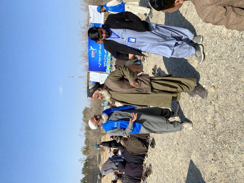 Several men stand outside on a bright day. Some wear traditional clothing, including hats and vests. One man sports a blue vest with a logo. Another has a lanyard around his neck. A sign with Arabic writing is visible in the background. The ground is gravelly and dry. The scene appears to be a gathering or meeting outdoors. A few bare trees stand along the horizon.