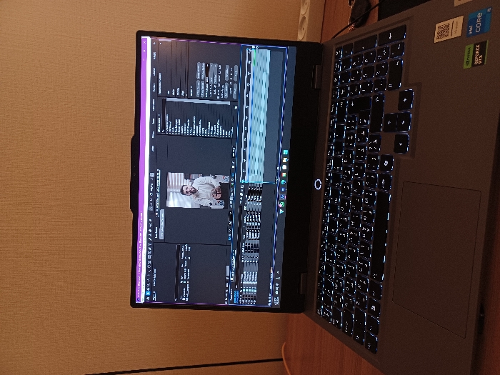 The scene is an interior view within Al-Midan Municipality, Syria, depicting a dark grey laptop resting on a wooden desk. The laptop screen is illuminated, displaying a video editing software interface, likely Adobe After Effects. A preview window within the software shows a medium shot of a male subject with a beard, wearing a light-colored shirt or jacket and a white beanie, smiling towards the viewer while holding a cup. The software interface includes a visible timeline with multiple tracks and various panels with text and icons. The laptop's keyboard is backlit with a white/blue illumination. Stickers on the lower right of the laptop deck identify it as having NVIDIA GeForce RTX graphics and an Intel Core processor, alongside a QR code. To the right of the laptop, a white power strip with two visible outlets and a partially visible black object, possibly keys, are present. An orange cable is visible extending from the left side of the frame. The background consists of a textured, light brown wall.
