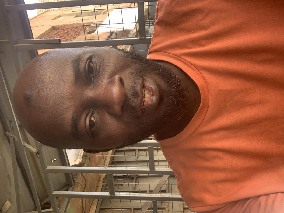 A close-up image depicts an adult Black male, approximately middle-aged, centered in the frame. He has a bald head with a dark, approximately 1cm diameter mark or scar visible on his forehead, slightly off-center to the right. He possesses a full, dark beard and mustache. His eyes are open, directed towards the viewer. His mouth is slightly ajar, revealing upper and lower teeth, with visible dryness or chapping on his lips. He is wearing a plain, round-neck orange t-shirt. The background is partially obscured but shows structural elements. Immediately behind the subject, a metal framework, possibly part of a grille or scaffolding, is visible. Beyond this, a light brown or reddish-brown building wall is present, consistent with brick or stucco, suggesting an urban environment. A white, rectangular object, possibly a portion of a satellite dish or similar utility, is partially visible in the upper right background, behind the metal structure. The scene is located in Sabon Gari East, Nigeria.