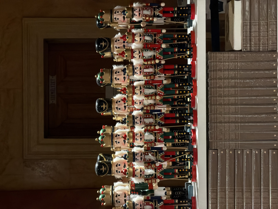 - "An indoor scene displays a symmetrical arrangement of wooden nutcracker figurines positioned on a white shelf above several rows of books" by FM-7gWCF3, licensed under CC BY 4.0