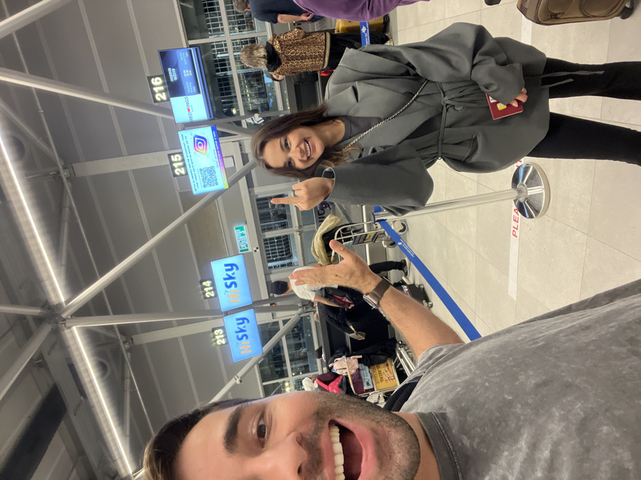 The image captures an indoor scene within an airport check-in hall, identified as Ben Gurion Airport (TLV) in Lod, Israel, based on the presence of Hebrew text and airline names "HiSky" and "Red Wings" on overhead display screens. In the immediate foreground, a male subject is partially visible from the chest up, on the left. He has dark hair, a short beard, and is smiling widely with an open mouth. He wears a grey, textured t-shirt, and his right hand is raised with an open palm, fingers splayed. A brown watch is visible on his left wrist. To the right, a female subject stands, facing the camera with a broad smile. She has long dark hair and is dressed in a dark grey oversized blazer, belted at the waist, over a dark t-shirt and black pants. She carries a thin chain shoulder bag. Her left hand holds a red passport, while her right hand is raised with the middle finger extended towards the camera. In the mid-ground, multiple illuminated digital display screens hang above check-in counters. Screens 213 and 214 display "HiSky." Screen 215 features a QR code, an Instagram logo, and Hebrew text. Screen 216 shows "REDWINGS." Queue stanchions with blue retractable belts define the queuing area. Several other individuals are visible in the background, including one person in a white t-shirt near counter 214 and another in a leopard-print coat near counter 216. Various pieces of luggage and a luggage cart are also present on the light-colored tiled floor. The ceiling features exposed metal trusswork and linear fluorescent lighting.