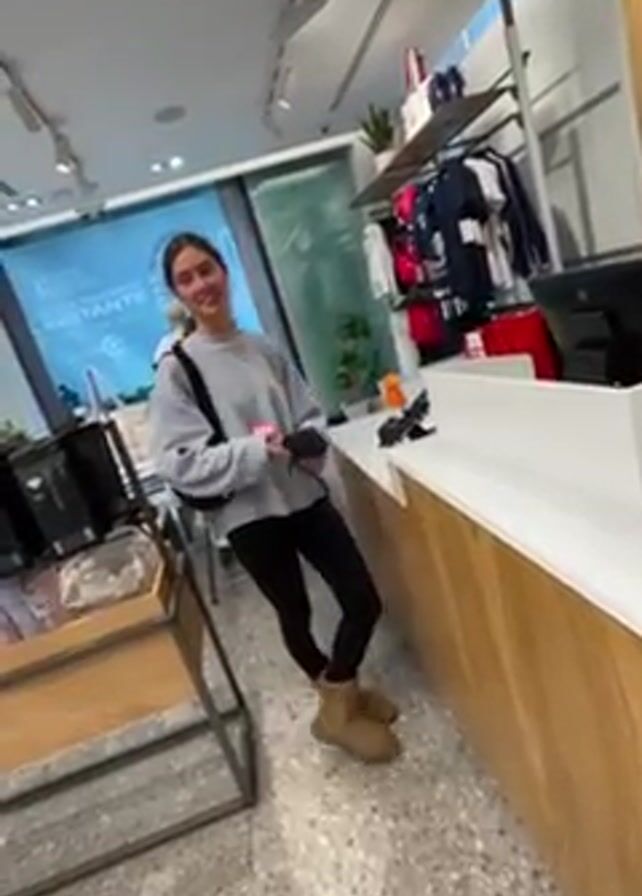 A young woman wearing a gray sweatshirt, black leggings, and tan boots stands at a retail checkout counter