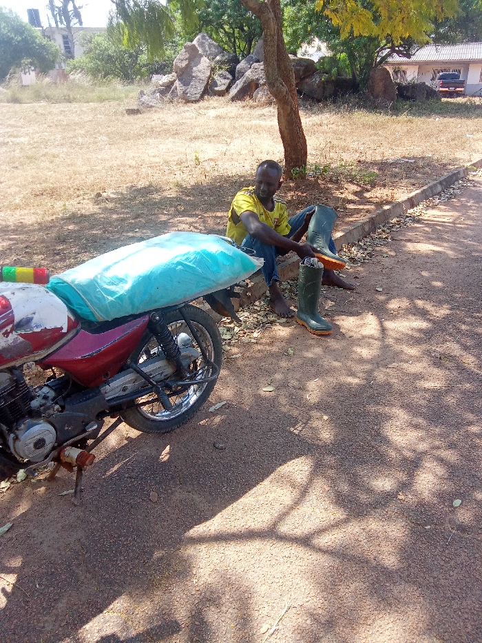 In Bar Jirgi Summa, Nigeria, an outdoor scene captures a male individual seated on a low concrete curb beside a dirt path. The man, with dark skin, short dark hair, and light facial hair, wears a yellow t-shirt with a graphic and blue jeans, and is barefoot. He holds a dark green rubber boot with an orange sole in his left hand, appearing to manipulate its interior with a small orange-handled tool held in his right hand. A second identical boot rests upright on the ground near his right foot. To the left, a red and white motorcycle with visible rust and wear is parked on its side stand, facing left. A large, light turquoise blue package, possibly wrapped in plastic, is secured to its rear seat/rack. A red, yellow, and green stripe is visible on the rear of the motorcycle. The ground in the foreground and mid-ground is reddish-brown dirt or gravel, mottled with tree shadows. Behind the man and the curb, an expanse of dry, light brown grass extends into the background. Several trees with sparse foliage cast shadows. Prominent grey rock formations are visible behind the grassy area. In the far background to the right, a white building with a dark roof is partially obscured by trees, with a dark vehicle parked nearby. The scene is brightly illuminated by direct sunlight.