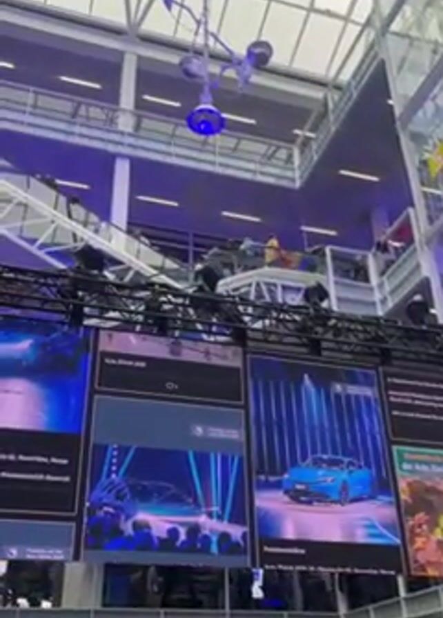 interior of a large event space, possibly an auto show. There are multiple levels, with people visible on the upper level using escalators. The central focus of the frame is a large screen display showcasing promotional material for "Auto Zurich 2023", featuring images of a sleek, blue car. Suspended from the ceiling is a lighting fixture with multiple spotlights. The overall lighting is a mix of natural light from the glass ceiling and artificial lighting, with a noticeable blue hue. A sound effect, possibly a musical cue, can be heard.