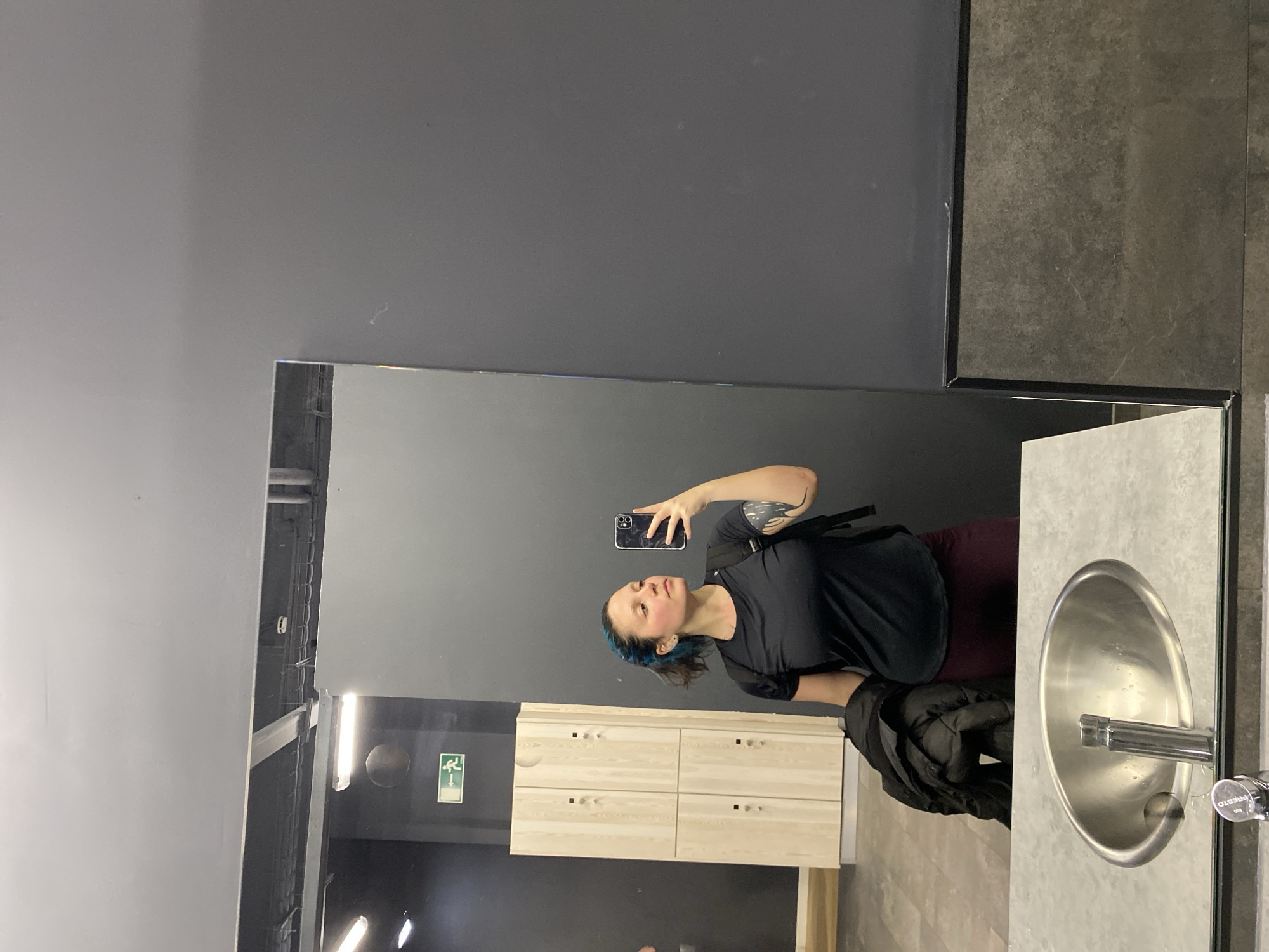 A person is taking a selfie in a mirror in what appears to be a gym changing room or restroom. The person has dyed blue hair and a tattoo on their left arm. They are wearing a black t-shirt and maroon leggings. They are holding a smartphone in their right hand to take the photo. Behind the person and reflected in the mirror are light-colored lockers. To the right of the mirror is a sink with a stainless steel faucet. The walls are dark gray. Given the presence of signage in Spanish (the emergency exit sign with "Salida" above the arrow) and the general architectural style, it's plausible the location is in Gijón/Xixón, Spain, as requested. However, without more distinctive regional characteristics, this cannot be confirmed with certainty.