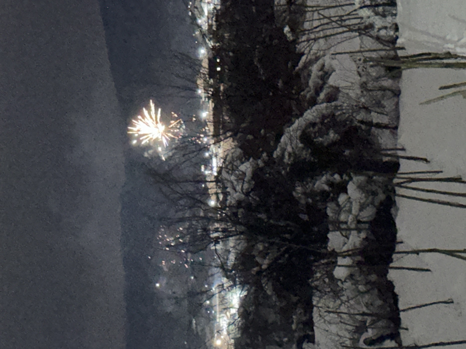 Night scene with fireworks illuminating a snowy landscape. A bright firework bursts in the sky amidst bare trees. Below, a line of lights suggests a street or town in the distance. Snow-covered trees and ground are visible, with some stick-like structures jutting out from the snow. The left side is dark, possibly a cloudy sky. The overall impression is a winter night celebration.