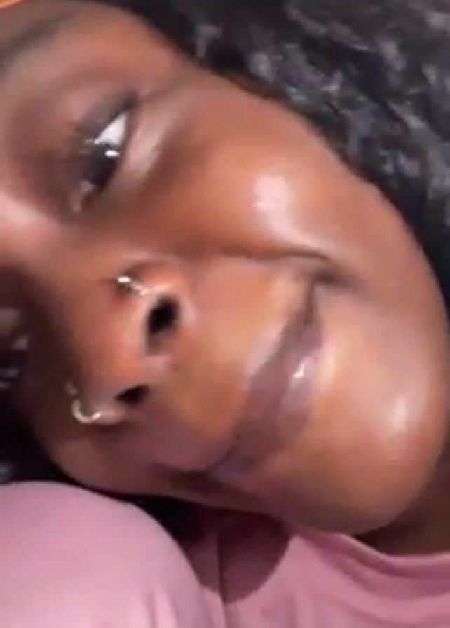 A close-up video features a young Black woman with curly hair and a patterned headscarf, topped with sunglasses. She has a nose ring and glossy lips. She wears a pink shirt. She is smiling and looking at the camera. Music is playing in the background.
