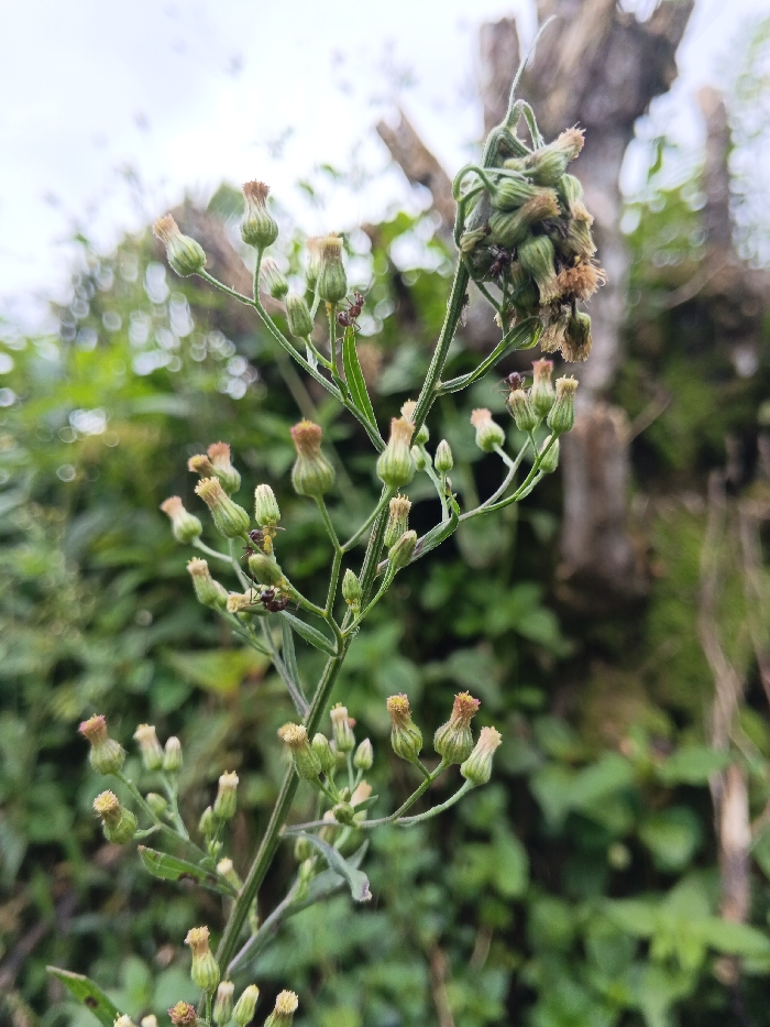 A weed plant with small, budding flowers dominates the frame. The buds transition from green to brown, with tiny white petals emerging. Ants crawl on the stem and flower heads. Lush green foliage forms a backdrop, with blurred hints of branches and sky. The focus is sharp on the plant, emphasizing its texture and the presence of the insects.