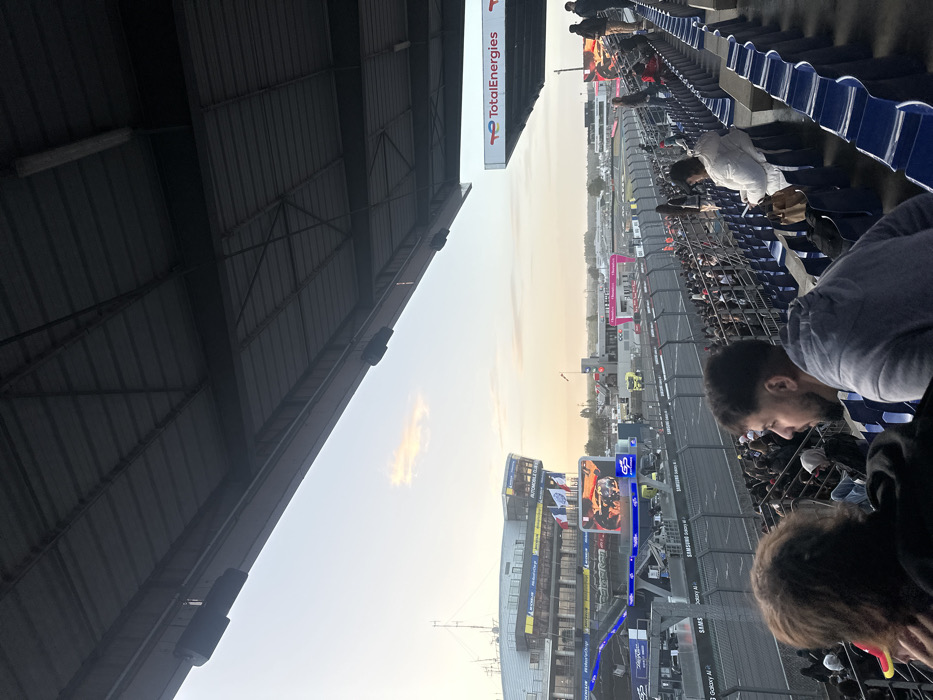The image depicts a panoramic view from within a covered grandstand at a motorsport circuit, identified as the Circuit de la Sarthe in Le Mans, France, evidenced by the "AUTOMOBILE CLUB" building and French flags in the background, a primary identifier of the Automobile Club de l'Ouest (ACO). The scene is illuminated by the soft, warm light of either sunrise or sunset. In the foreground, the dark grey, corrugated metal underside of the grandstand roof, supported by steel beams, occupies the top portion of the frame. Cylindrical black speakers are mounted beneath these beams. Below, the blue, hinged stadium seats of the grandstand are partially visible, with scattered spectators. A male with short dark hair and a beard, wearing a grey hooded sweatshirt, is prominent in the bottom center-right, looking towards the track. To his left, a person with long dark, curly hair is partially visible from behind. Further right, a person in a white puffy jacket is seated, looking down at a mobile phone. The midground features the asphalt race track, bordered by a black safety fence and trackside barriers displaying sponsor logos, including "Samsung Galaxy A." Behind this, a dense crowd of spectators stands along the barrier. Beyond the track, to the left, a multi-story, modern building with "AUTOMOBILE CLUB" signage and French flags is visible, accompanied by a large digital screen displaying a close-up image of a racing car and other graphics. To the right, a large white sign with "TotalEnergies" in red is mounted on a metal structure, with several figures standing on a platform nearby. Distant buildings, trees, and a hazy horizon line are visible under a clear, pale sky with a single, elongated, reddish-orange cloud.