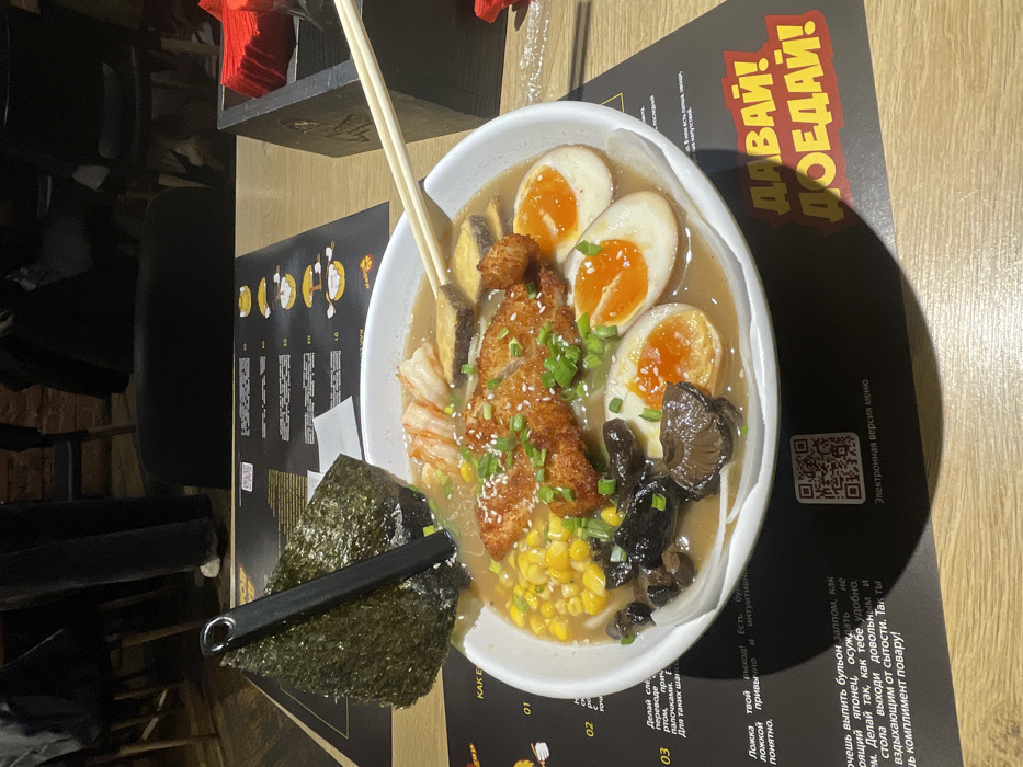 A large white ceramic bowl of ramen is centrally positioned on a light wood-grain table within a restaurant in Saint Petersburg, Russia. The ramen contains a light brown broth, noodles, two pieces of fried chicken katsu, yellow corn kernels, sliced dark mushrooms, three peeled soft-boiled eggs halved lengthwise displaying bright orange yolks, several cooked shrimp, and thin slices of a yellow root vegetable, possibly sweet potato. The dish is garnished with chopped green onions and white sesame seeds. A black serving utensil with a loop handle, partially submerged in the broth, supports a large, dark green sheet of nori (seaweed) standing upright in the bowl. A pair of light-colored wooden chopsticks rests horizontally across the rim of the bowl. The table is covered by dark gray placemats with white and yellow text in Cyrillic. One section displays a QR code labeled "Электронная версия меню" (Electronic version of the menu). Another prominent section features a large red and yellow graphic with the text "ДАВАЙ! ДОЕДАЙ!" (Come on! Finish it!). Diagrams illustrating how to eat ramen are also visible on the placemat. In the blurred background, dark chairs and tables are visible, along with out-of-focus figures of individuals, suggesting other patrons. A dark wooden container, possibly holding napkins, is present to the right of the ramen bowl. A muted reddish-brown brick wall texture is faintly discernible in the upper left background.
