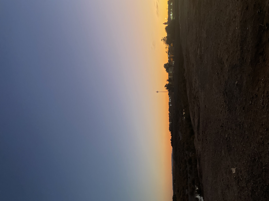 A landscape view presents a striking contrast between the sky and the ground. The sky shifts from deep blue to a radiant orange, indicative of a sunset or sunrise. A dark landmass occupies the right half, likely a field or terrain. Silhouetted against the bright horizon is a line of trees and buildings, punctuated by a lone tower. The image, rotated, gives the impression of a world divided between day and night.