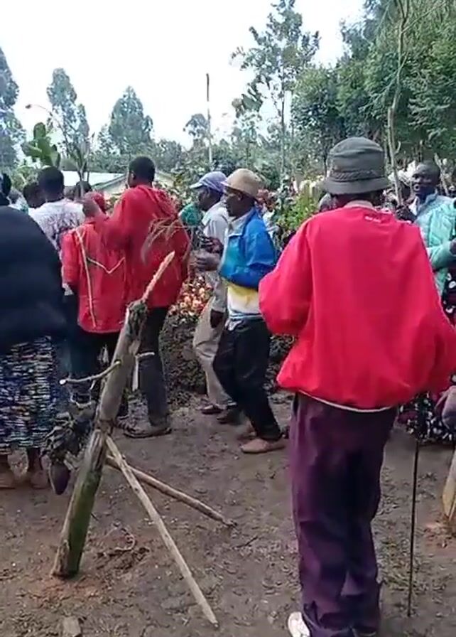 The video depicts a group of people gathered outdoors, seemingly in a village or rural setting. The ground is muddy, and there are trees and foliage in the background. Many of the individuals are dressed in colorful clothing. Some are dancing or moving around a mound of earth decorated with flowers or other objects. One person is wearing a red jacket and a hat, and holding a cane. There's a crude structure made of sticks in the foreground. There appears to be singing or music in the background. The overall impression is that this is a cultural or ceremonial event.