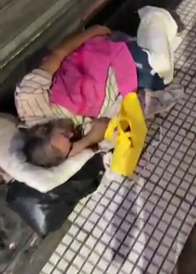 A woman is lying down on the ground, seemingly asleep. She is lying on a pillow and covered with blankets or clothing, including a pink shirt or blanket. She is lying on a tiled surface, possibly a sidewalk. Next to her is a yellow object, possibly a bag or container. The background includes a metal structure, possibly a closed storefront.