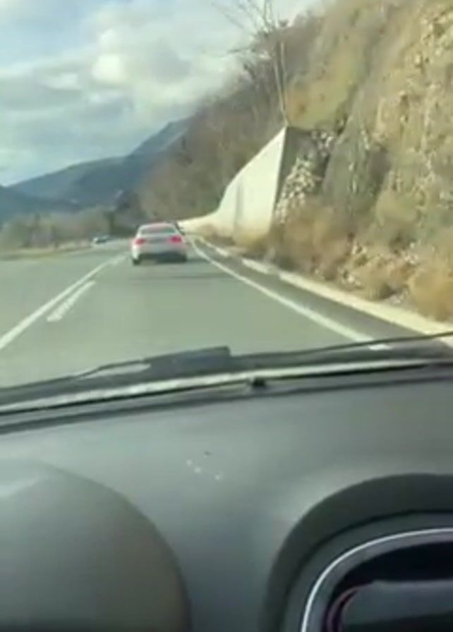 The camera is positioned inside a car that is driving on a two-lane highway