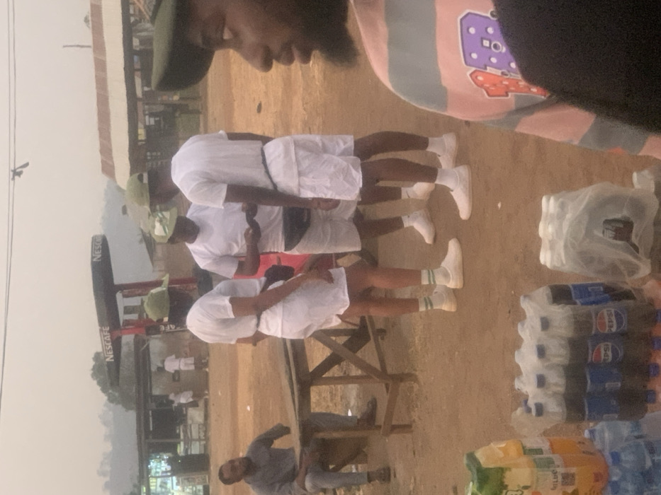 Three individuals in white shirts, shorts, and shoes stand together, wearing matching green hats. One seems to be looking at a mobile device. Other people sit on a bench in the background near a Nescafé Cafe building. Bottles of Pepsi and water are on the ground next to them, ready to be sold. Another person is sitting underneath the bench they are standing in front of.