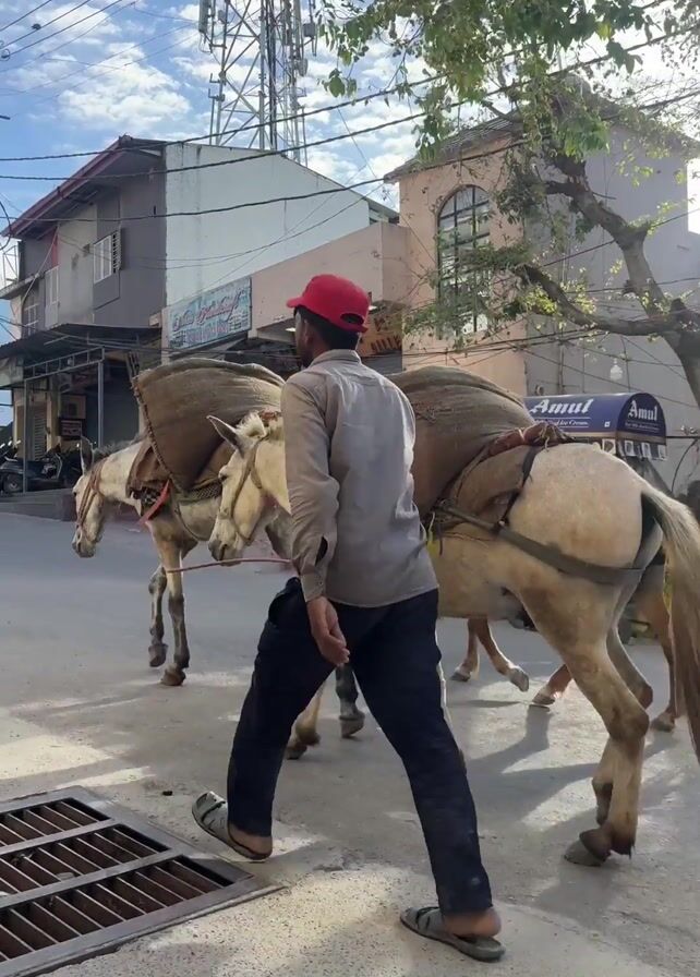 A man is walking down a street with three mules. The man is wearing a gray shirt, dark pants, and sandals, and a red baseball cap. The mules are carrying large, burlap-covered loads. The street is paved and has a drain in the foreground. Buildings line the street, some with closed metal shutters, and there is a cell tower in the background. The sky is blue with some white clouds, and there are mountains visible in the distance.