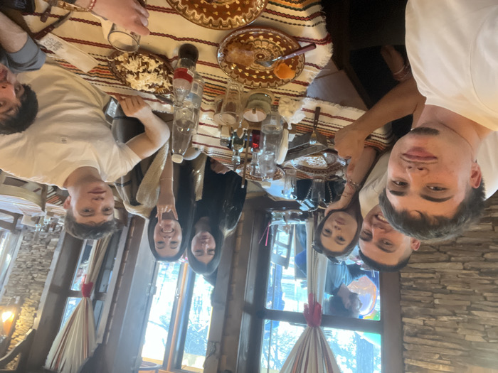 An indoor scene in a rustic-style restaurant in Samokov, Bulgaria, depicts approximately seven individuals seated around a large table set with food and beverages
