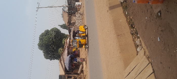 This image captures a semi-urban roadside scene in Abuja, Nigeria, under a hazy daylight sky