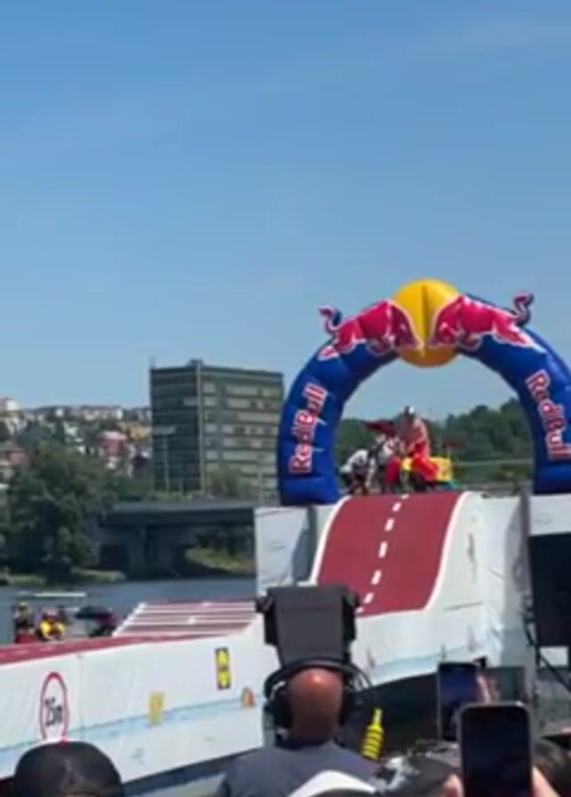 The video captures a Red Bull event taking place outdoors on a sunny day. In the foreground, there's a crowd of people, some holding up their phones to record. A man with a shaved head is seen operating a camera. Behind the crowd, a platform with a ramp is visible, marked with the Red Bull logo. On the ramp, a person dressed in a red swimsuit is about to descend on a small, yellow, hand-powered vehicle. The background includes a river and a city skyline.
