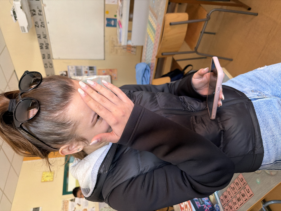 A young female stands in a classroom located in Panagyurishte, Bulgaria. She wears a black puffer jacket over a grey hooded sweatshirt and light blue denim jeans. Her brown hair is pulled into a high ponytail, with black sunglasses perched on top of her head. Her left hand, featuring long, light-colored manicured nails, covers the lower half of her face, while her right hand holds a light pink smartphone horizontally, oriented towards her. She appears to be looking downwards or to her right. In the background, classroom elements include light yellow walls, a whiteboard with a list of elemental symbols (Ca, Na, Mg, Al, Zn, Fe) above it, and a ceiling-mounted projector. Wooden desks and chairs are arranged throughout the room. A second individual is partially visible in the far-left background. The floor is a light brown color.