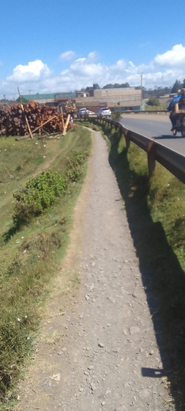 The image displays a daytime outdoor scene in Flyover, Kenya. A gravel pathway, approximately 1.5 meters wide, extends from the foreground to the mid-ground, gently curving to the right. It is flanked by green grass and low-lying vegetation. Shadows are cast across the right portion of the pathway, originating from an unseen object to the immediate right. To the right of the path, a metal guardrail with brown posts parallels the path, separating it from a paved two-lane road. On this road, a light-colored sedan and a white hatchback are visible in the distant lane, heading away from the viewer. A motorcycle, with a blue object secured to its rear, travels on the paved road in the mid-ground, also moving away from the viewer. On the left side of the pathway, a large, stacked pile of cut logs, primarily brown, occupies the space from the mid-ground to the background. Some lighter-colored wooden supports are visible within the log pile. Beyond the log pile and across the road, various low-rise buildings with mixed architectural features and rooflines are present in the background. A utility pole stands among these structures. The sky above is clear blue with scattered white cumulus clouds. No direct human interaction beyond the motorcyclist is discernible.