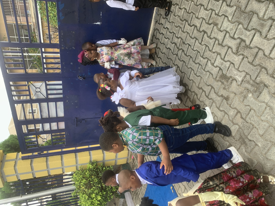 group of children in a school uniform standing in a line outside a school gate in Close, Nigeria