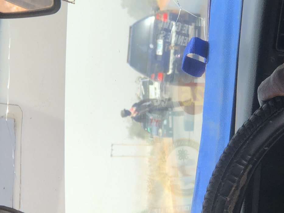 The image displays a dusty road scene in Dan Tatashi, Nigeria, captured from the interior perspective of a vehicle