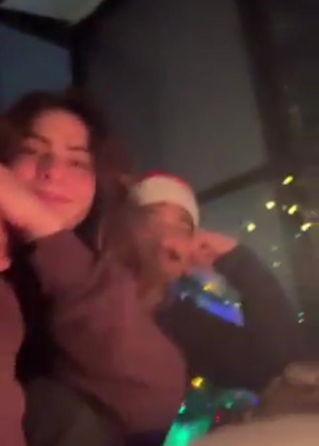 young woman and a young man. The woman has medium length brown hair and is wearing a brown hoodie. The man has dark hair, a mustache, and is wearing a Santa hat. They are standing close together, smiling at the camera. The man puts his arm around the woman and pulls her closer. There are Christmas lights in the background.