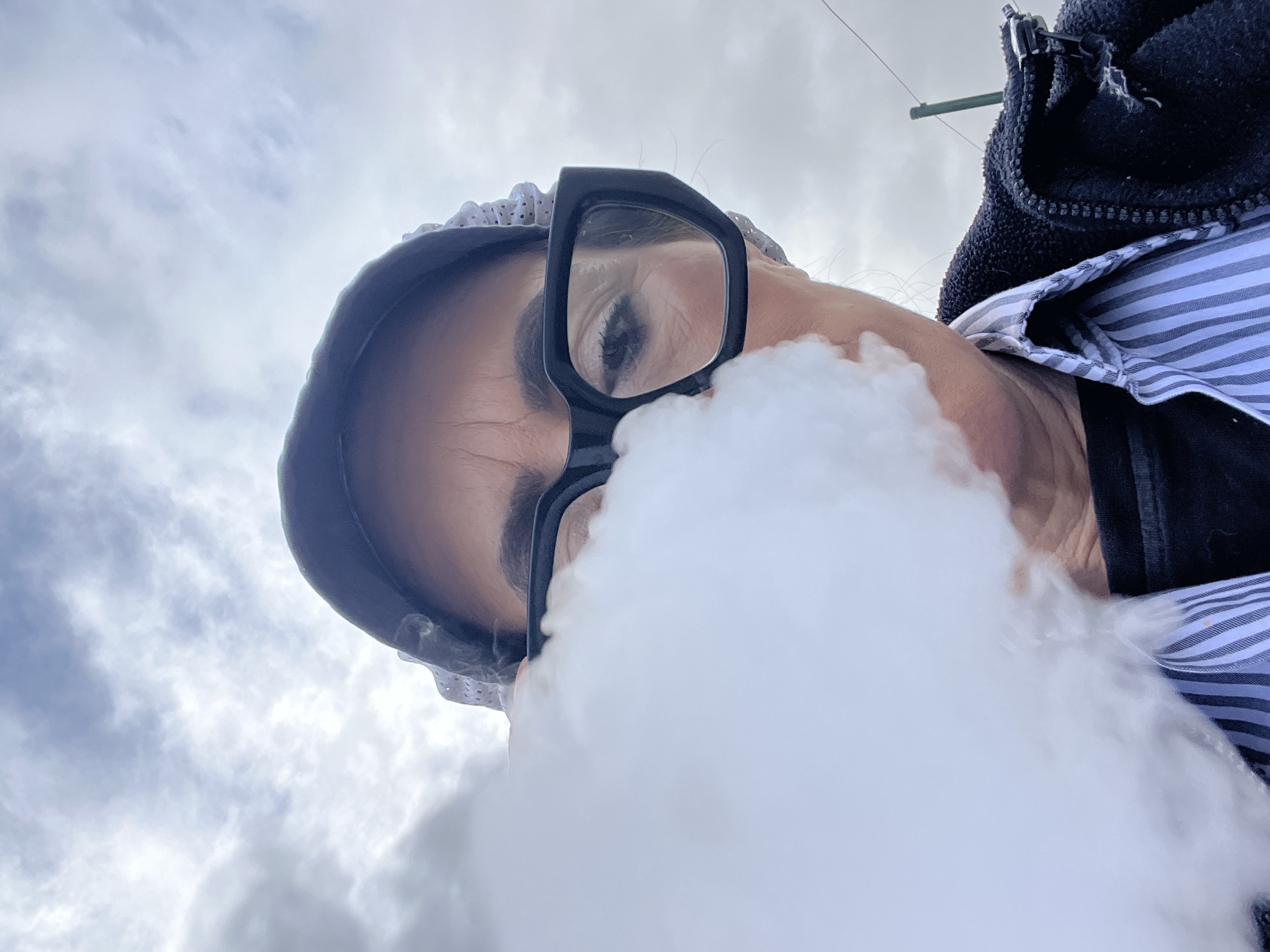 In Mensdorf, Luxembourg, a low-angle, close-up photograph depicts an adult female subject exhaling a dense plume of white vapor that largely obscures the lower half of her face. The subject wears large, black-framed glasses, a white bonnet or cap with small white polka dots, a striped blue and white collared shirt, and a dark, possibly fleece, zippered jacket. Her right eye is visible through the lens of her glasses, showing a dark iris and visible eyelashes. The sky, characterized by scattered white and gray clouds, forms the background. A dark green pole or stake is partially visible in the upper right quadrant of the image, behind the subject's right shoulder.
