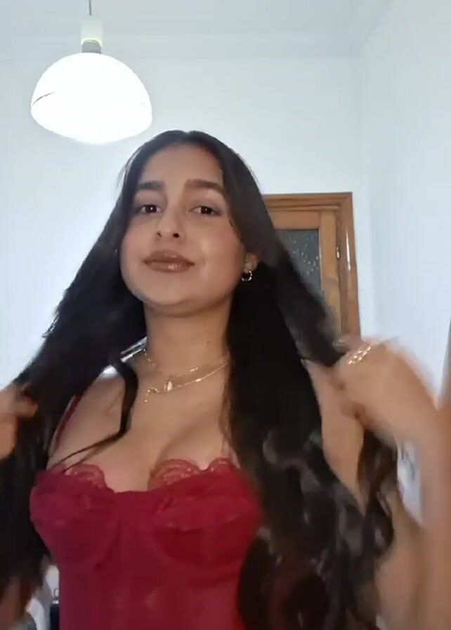 A woman is in a bedroom. The room has white walls, a light fixture, and a wood door. The woman has long, dark hair, a gold necklace, and a red lace top. She is wearing makeup and has painted nails. She is smiling and making hand gestures.