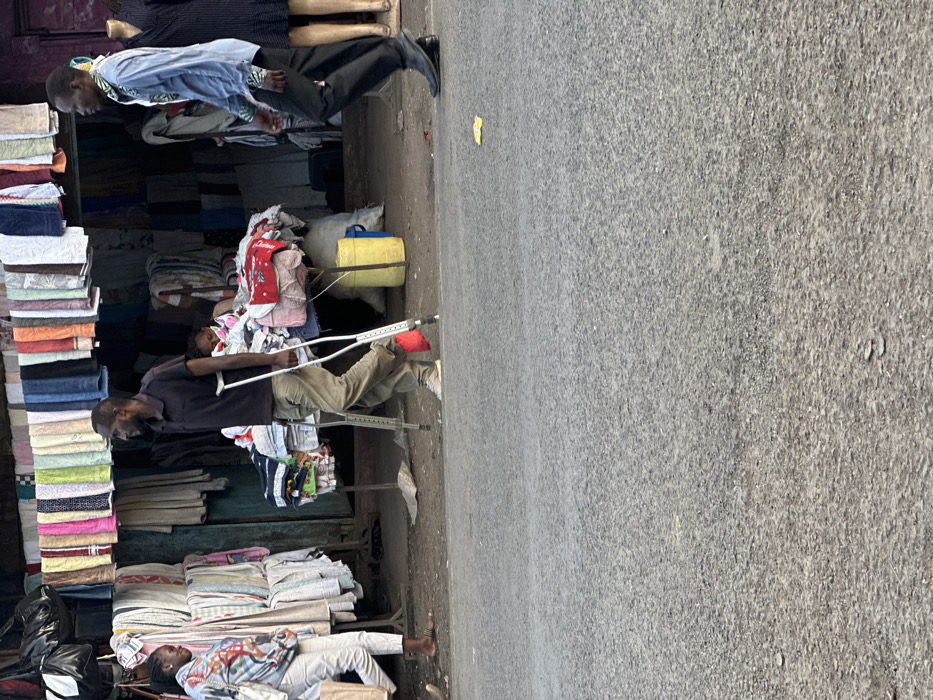 A street scene presents a row of stacked textiles beside a concrete road. A man using crutches stands near the stacks. Another person lies on the ground near the textiles. Further down the stacks, an individual seems to be sleeping on top of the pile. In the background, a man walks by. The scene evokes a sense of an informal marketplace along a street.