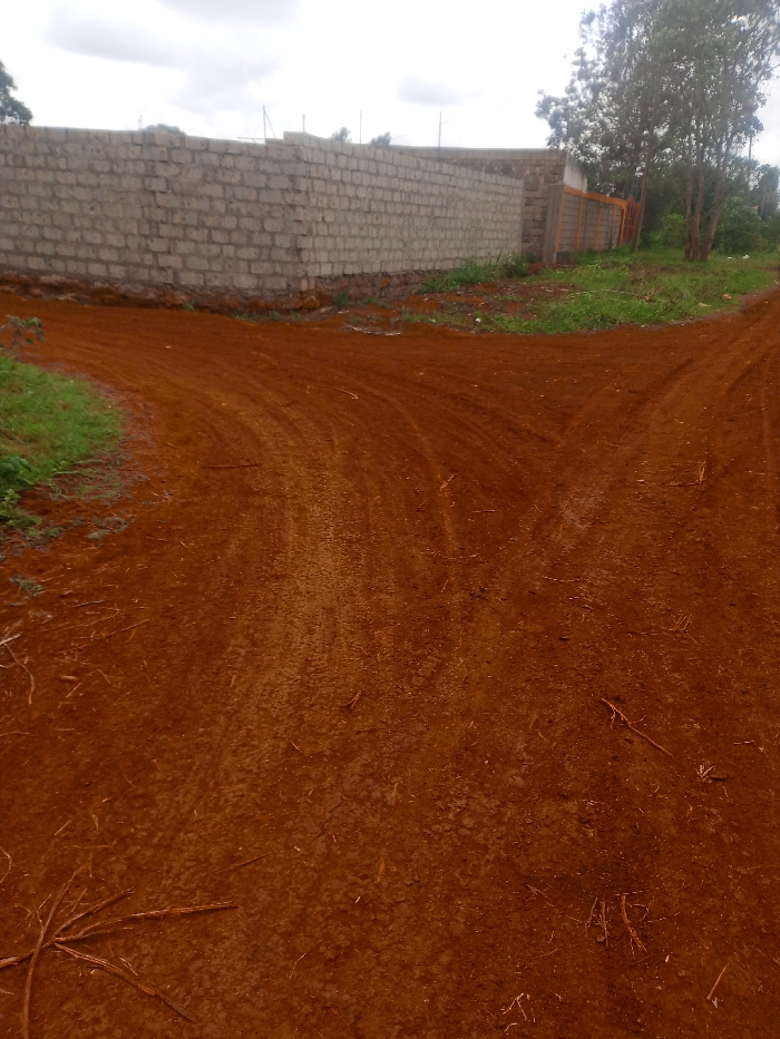 A dirt road splits into two paths. The red-brown soil is marked with tire tracks. A high grey block wall borders the road, with a section of wooden fencing further along. Greenery grows along the edges of the road and near the wall. A tree stands to the right of the wall under a cloudy sky.