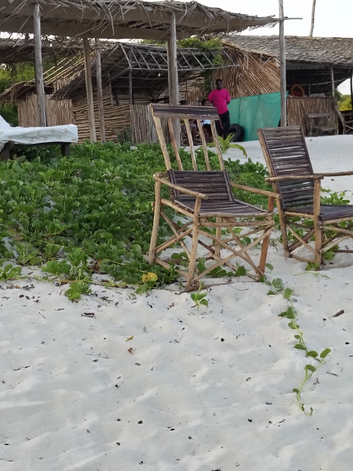 The scene depicts a sandy beach environment located in Gombato Bongwe ward, Kenya. The foreground consists of light-colored sand with sporadic patches of green, vine-like vegetation. In the mid-ground, two rustic wooden chairs are positioned on the sand. These chairs are constructed from light-toned natural wood for the frames, with darker, horizontally slatted seats and backs. A dense area of green, broad-leafed vegetation separates the chairs from the structures in the background. In the background, several open-sided structures are visible, characterized by their construction from natural materials such as vertical wooden poles, woven reeds, and thatched roofs supported by wooden posts. A male individual stands centrally among these structures, wearing a bright pink short-sleeved shirt and dark trousers. He is partially obscured by the foreground chairs and foliage. To his left, a white fabric-covered object, resembling a mattress or sunbed, rests on a raised platform. To his right, a section of one structure features a prominent turquoise-green tarp, with a black vehicle tire positioned on the sand nearby. Behind the green tarp, one or two additional individuals are partially visible, appearing to be seated. An additional circular object, possibly a lifebuoy, is discernible further back within the structures.