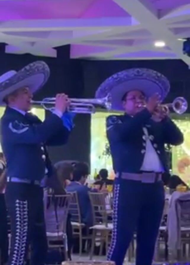 Two mariachi musicians are playing trumpets in a banquet hall. They wear traditional attire consisting of dark jackets, pants, and large grey sombreros. The hall is decorated with white geometric ceiling structures and accented with pink and white lights. Guests are seated at tables in the background. The musicians are focused on their performance.