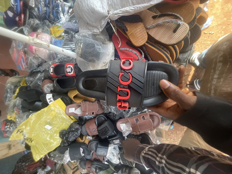 The image depicts an outdoor market stall in Nnobi, Nigeria, displaying a large quantity of footwear. The ground beneath the display consists of reddish earth. Numerous pairs of sandals and slides, many individually packaged in clear plastic bags, are piled together. Visible brands on various footwear include "GUCCI" (prominently displayed), "VALENTINO," "LEXUS," "H" (resembling Hermes), "PRADA," and "DIOR." Styles range from black slides to brown leather-like sandals and colorful flip-flops, some embellished with rhinestones. A yellow plastic bag and a large white woven sack are also visible among the merchandise. A white vertical support pole is present in the background. In the foreground, two dark-skinned human hands hold a black slide featuring "GUCCI" in raised red letters. To the left, a person's forearm, clad in a brown and black plaid shirt, reaches into the footwear pile. At the bottom, a person's feet, wearing black and white striped slides, are visible. The scene suggests a commercial interaction or inventory management within a retail setting.