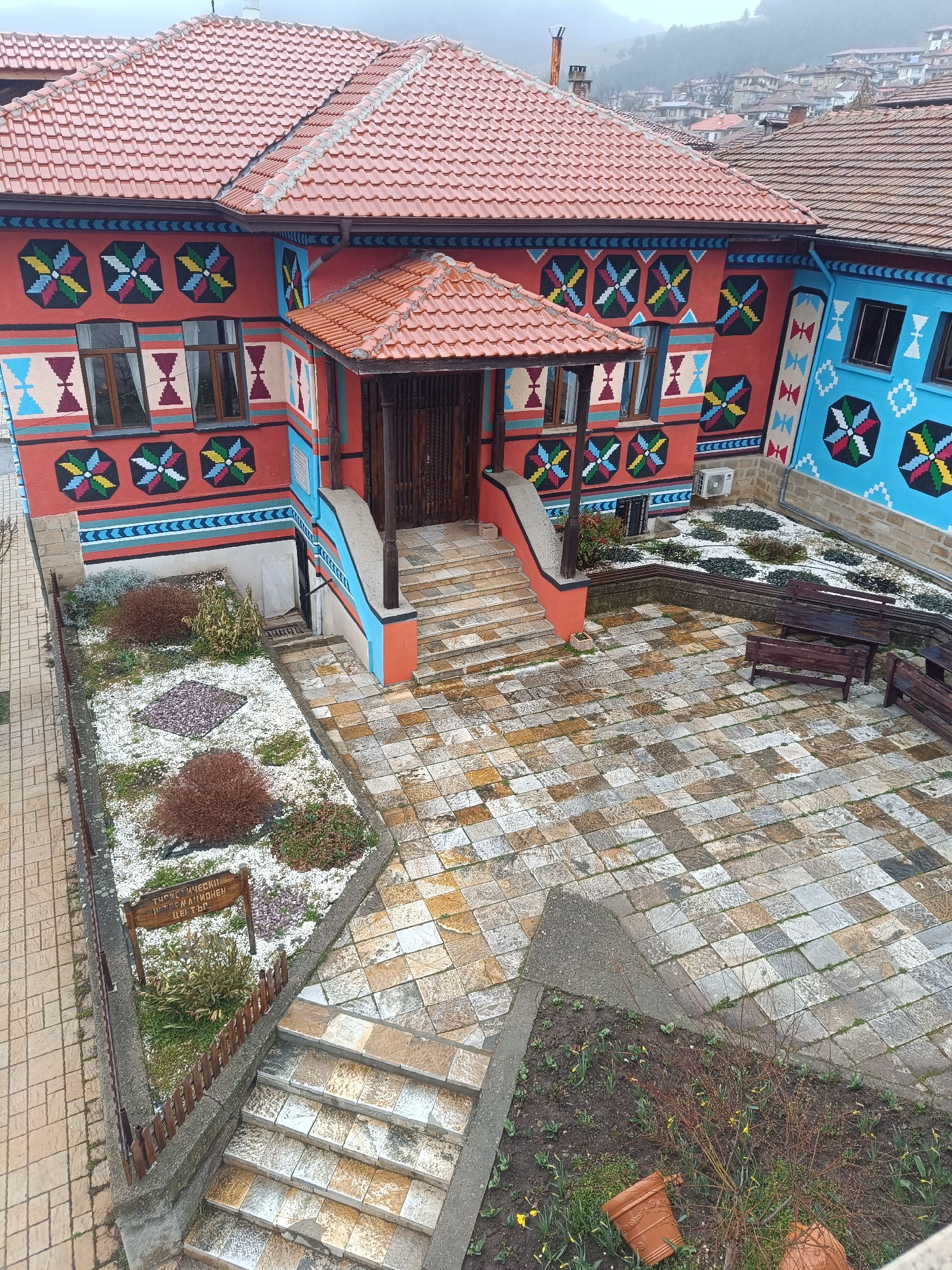 high-angle view of the Tourist Information Center in Kotel, Bulgaria. The building is two stories with a red tile roof and brightly painted exterior walls. The front façade features geometric patterns in red, blue, yellow, and black. Windows are visible on both levels. A wooden porch with a red tile roof covers the entrance. Steps lead up to the entrance from a stone-paved courtyard. The courtyard includes flowerbeds with white gravel and plants. Benches are arranged around the courtyard. A sign in Bulgarian is visible in a flowerbed. Additional steps lead away from the courtyard. The background shows a blurred view of the town with buildings and trees. The sky is overcast. No people are visible.