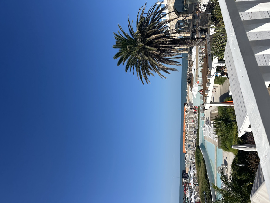 This image depicts a coastal resort scene in Mar del Plata, Argentina, viewed from an elevated perspective on a clear, sunny day. A white wooden railing in the foreground frames the lower left and right portions of the image. The midground features a multi-level resort complex. On the right, a large palm tree with dark green fronds stands tall, partially obscuring a light-colored building constructed of stone or stucco, which includes arched architectural elements. To the left, a light-blue swimming pool occupies a central area, surrounded by numerous white lounge chairs. Several individuals are present around the pool and on adjacent paved or landscaped areas, some seated, others standing. Green vegetation, including hedges and smaller palm-like plants, is visible throughout the resort grounds. Further to the left, a sandy or grassy section contains additional white lounge chairs and umbrellas, with more people visible beneath them. A white, open-sided structure with a wooden slatted roof is situated near the pool on the right, covering an outdoor area. The background reveals the Atlantic Ocean extending across the horizon, topped by a cloudless, bright blue sky. A beach area separates the resort from the ocean, where multiple white tent-like cabanas or covered seating areas are arranged in rows. In the ocean, a large, rectangular orange structure, possibly a pontoon or temporary platform, is visible. To the left of this orange structure, darker, possibly metal, container-like structures are present on the shoreline. The scene indicates a leisure environment with active human presence.