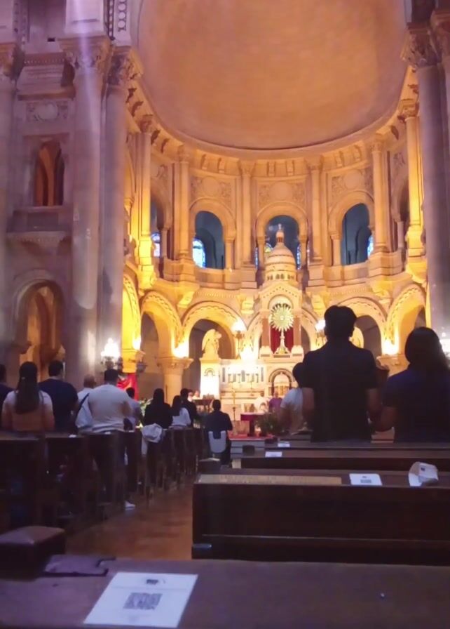n interior view of a church where people are seated in pews, facing the altar. The church features ornate architecture including high ceilings, arches, and pillars. The altar area is illuminated, contrasting with the darker foreground. People are mostly sitting quietly, seemingly engaged in prayer or attending a service. There is a QR code on a small piece of paper, presumably a hymn sheet, in the foreground.