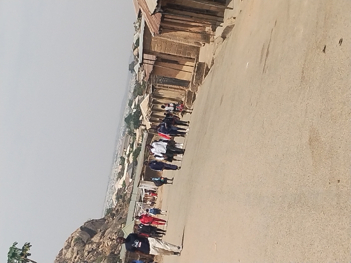 This image shows a street scene in New Stadium, Nigeria, under bright, possibly hazy, daylight. A light-colored paved road, likely asphalt, inclines from the foreground into the distance. Approximately 15 to 20 individuals, primarily adults and some children, are walking along this road. In the foreground on the left, a male in a dark t-shirt with a light graphic and light trousers walks towards the viewer's left. Other pedestrians, dressed in various casual attire including t-shirts, shirts, trousers, and skirts, are distributed further along the road, mostly moving away from the camera. Some carry bags or backpacks. To the left of the road, a large, exposed geological formation of light-brown and grey rock or granite rises steeply. A small amount of green foliage, possibly a tree branch, is visible at the very top left. Along the right side of the road, a continuous line of single-story buildings is present. These structures appear to be constructed from earth-toned materials, potentially brick or mud, and are topped with weathered, rust-colored or dull grey corrugated metal roofs. In the background, beyond the immediate structures, a sprawling urban or residential area with numerous buildings extends under a pale, hazy grey sky. No distinct shadows are evident, indicating high sun or diffuse lighting conditions.