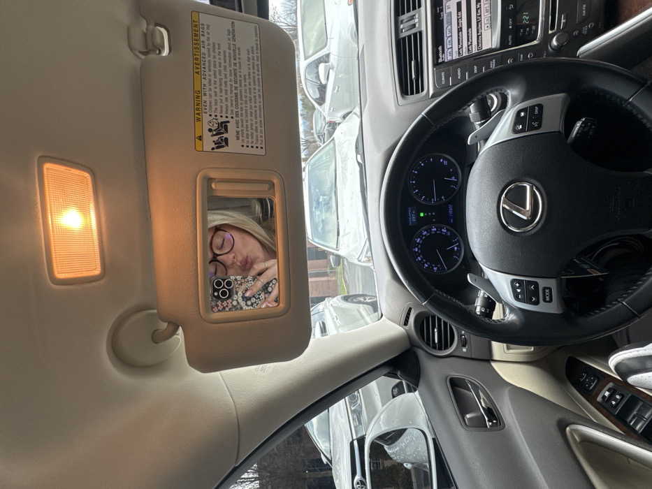 A car interior features a sun visor with a mirror reflecting a woman in glasses, puckering her lips, and holding a phone. The visor has a warning label. Adjacent is a dashboard with climate control buttons and a steering wheel with the Lexus logo. The speedometer reads 237. Outside, multiple cars are visible, suggesting the car is parked in a lot or on a street. The time displayed is 2:21.